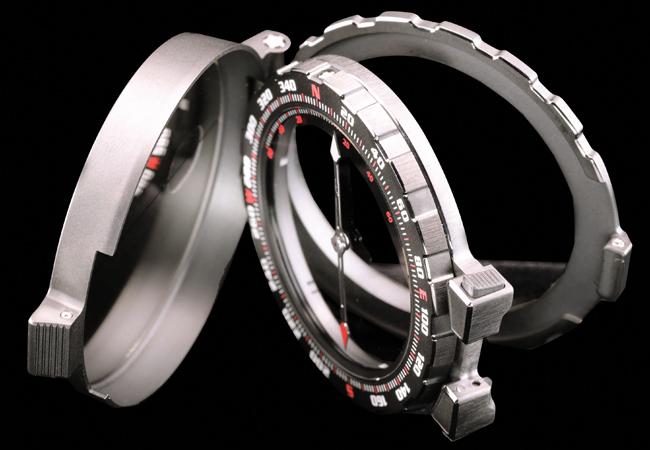 它還配備兩種可以替換的錶圈,第一種是三層結構的指南針錶圈,除了上蓋是由TPT®碳纖維製作之外,中層的指南針外殼、底座都是以鈦合金打造。第二種是Daytime日間雙向旋轉錶圈,它的體積較小,可以在有太陽的時候按照時錶法以腕錶指針和太陽位置來判斷正確的方位。
