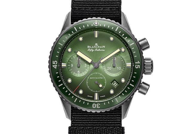 寶珀BLANCPAIN從不拘泥傳統,全新五十噚深潛器Fifty Fathoms Bathyscaphe 飛返計時碼錶,鮮活的綠面。是在呼應著碧綠水色,也是在訴說著所謂「求新」,不見得要大鳴大放,也是可以很小品的。