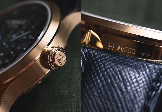 設計概念來自HORAGE品牌標誌的K-Tou陀飛輪,該41mm錶殼是首度採用18K黃金材質,不過它使用的是18K、3N的淡色玫瑰金,Andreas表示,在瑞士18K金有工業顏色標準配方,分別以1N到7N標示,2N是我們一般熟知的18K黃金色、5N則是一般的玫瑰金色。