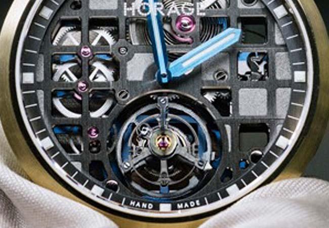 裝載在錶殼裡的陀飛輪機芯,是由HORAGE自家團隊製作的全新陀飛輪機芯,機芯外型上,因為它是由馬賽克磁磚式的方塊所組成的;所以鏤空基板與夾板的方形窗框,其實是代表HORAGE的標誌,同時可一窺機芯內部的構造以及傳動齒輪的運作。