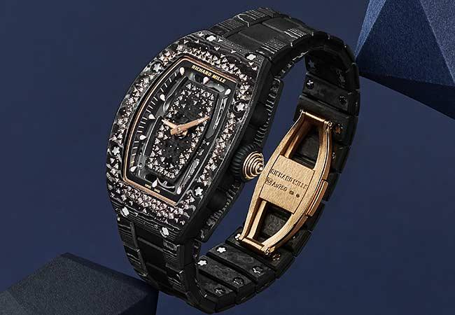 Carbon TPT ® 碳纖維從眾多材質中脫穎而出,最終打造成RM 07-01 Starry Night自動上鍊腕錶的錶殼和錶鍊。錶帶僅重29克,是專為女士系列而設計。這款亮眼迷人的腕錶採用全新的錶圈鑲鑽工藝,並恰如 其分地命名為“星夜”,向夜空群星致敬,以璀璨美鑽妝點優雅輪廓 。