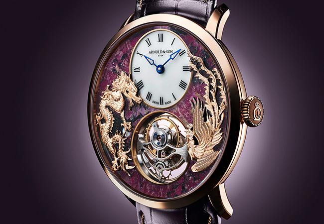 Arnold & Son重現了龍和鳳凰的神話。這兩隻比鄰的神話瑞獸有天決定一同錘鍊一顆明珠;一方用爪子,另一方則使用牙齒。這顆珍珠於是成為它們神力鑄就的非凡至寶。有天,玉皇大帝的尊親王母將明珠盜走,卻不慎將其遺落,兩隻神獸於是飛昇展翅想要接住它。這顆主宰智慧與生育的明珠,就是超薄陀飛輪龍鳳戲珠腕錶的靈感淵源。兩隻瑞獸長度僅有2公分,而在這兩公分的作品上以微雕工藝呈現龍鳳栩栩如生的姿態,精雕細琢、富張力且華麗貴氣,分別盤繞於錶盤兩側。其鱗甲、羽翎、露爪、牙齒、嘴喙、鬃毛等,完全採用18K玫瑰金手工鐫刻而成。龍爪間擒獲的是由珍珠母貝打造的明珠。 至於錶面盤,Arnold & Son巧妙運用了不同的色彩、材質和珍稀礦石。