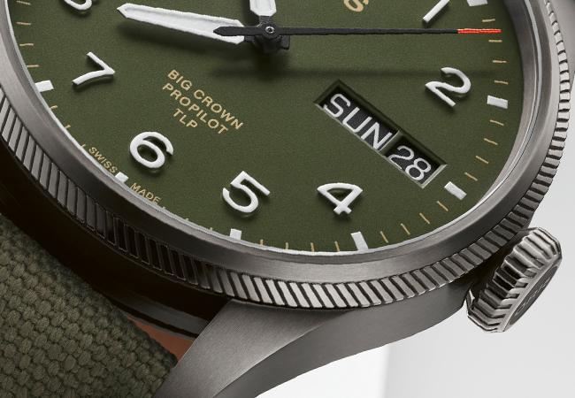 44mm防眩光的槍灰PVD不銹鋼錶殼,搭配墨綠色錶盤,靈感來自TLP飛行員的飛行裝,面盤上的米色取自TLP徽章中老鷹圖騰,並搭配綠色Ventile®錶帶。Ventile®在第二次世界大戰期間,瑞士首次為英國皇家空軍開發製造的耐磨、防風雨純棉織物。除了一般的限量款版本外,Oris為TLP畢業的飛行員提供量身定制的服務,可在腕錶底蓋刻上其姓名、計畫年分。套組包含Ventile®製作的橄欖色搭配橘色的旅行式錶袋,以及卡夾。此款腕錶腕體現了TLP的精神-卓越的培訓、增進友誼,促進國家間合作。