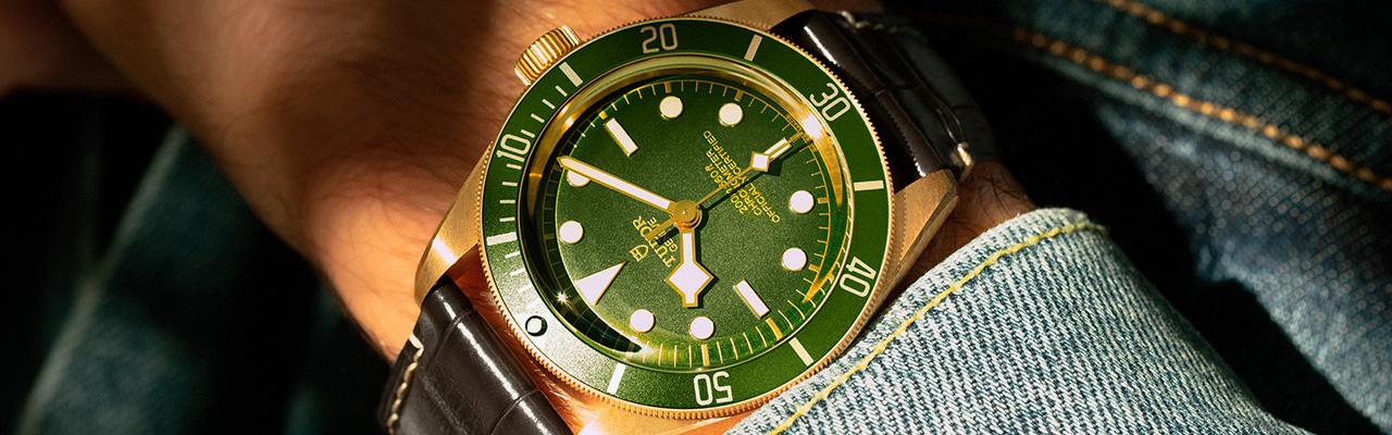 Black Bay Fifty-Eight 18K的一項重要元素,即啞面18ct黃金材質。錶面及外圈的優雅搭配,色澤濃郁的「金綠」色調,加上以啞面金色的細節裝飾,均突顯了這一材質的特別之處。「雪花」指針及立體鐘點標記同樣由18 ct黃金製成。隨附的織紋錶帶亦延續相同配色。作為帝舵表的一大標誌特色,織紋錶帶的使用最早可追溯至2010年,帝舵表也成為最早使用織紋錶帶的製錶品牌之一。此款錶帶由法國聖艾提安(St-Etienne)地區一家名為朱利安.富爾(Julien Faure)的公司製作,採用十九世紀提花織機編織而成,品質上乘,佩戴舒適。帝舵表於2010年巴塞爾世界鐘錶珠寶博覽會推出品牌首款配備該廠織紋錶帶的腕錶 —— Heritage Chrono(啟承計時腕錶),雙方由此展開密切合作。2020年,帝舵表與這家擁有150年歷史的家族企業迎來合作十週年紀念。