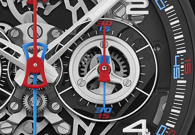 顯目的鮮紅色和電藍色導柱輪結構分別設置在面盤12點和6點位置。鏤空設計可以展現機芯各輪系、槓桿和齒輪的運動。精緻的表面處理展現了製錶師對於細節的重視,這些零件裝置在經黑色PVD處理的機板上。
