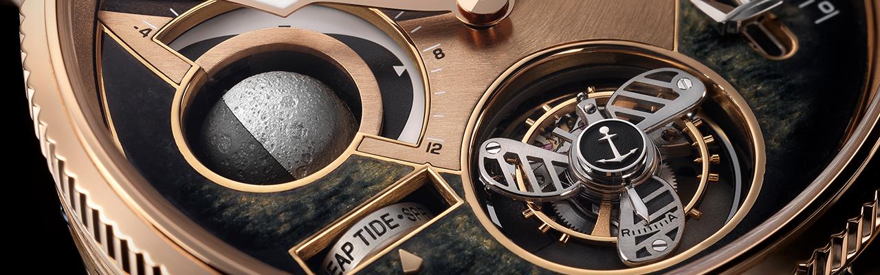 每個細節都至關重要,指針也從品牌一直以來的珍貴海洋時計中汲取靈感,得以精妙設計,於錶盤之上遊走,蔚爲壯觀,宛若指引方向的燈塔或浮於海面上的航標。這款腕錶的强大「心臟」由504個部件组成,機芯直徑37毫米,通過手動上鍊獲得動力,可以保證80小時動力儲存。「巡航速度」(振頻)達到21,600次/小時,其中陀飛輪裝置每小時旋轉60圈(或每60秒旋轉一圈)。機芯不僅提供時間顯示,還以3D立體方式展現了月相變化。機芯内置潮汐指示裝置,可以實時指示佩戴者所選地點的潮汐變化,同時指示潮汐的季節系數。通過轉動錶冠即可開啓調校模式,透過錶殼側邊的透明視窗,可 看到不同模式的切換狀態,其顯示方式與船上的傳令鐘相同。