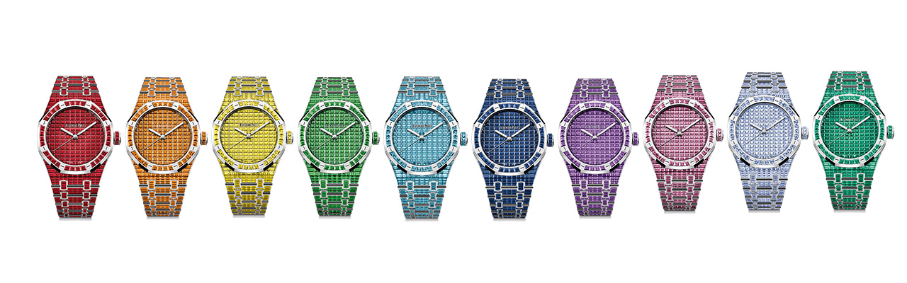 這兩組Royal Oak皇家橡樹系列自動上鏈腕錶秉承該系列50年來從未間斷的設計創新傳統,重新演繹經典彩虹腕錶。這一次,艷麗的紅、橘、黃、綠、藍、紫、粉紅七彩寶石不是在同一枚腕錶上散發絢爛虹光,而是分別用來妝點同一組中的十枚腕錶。