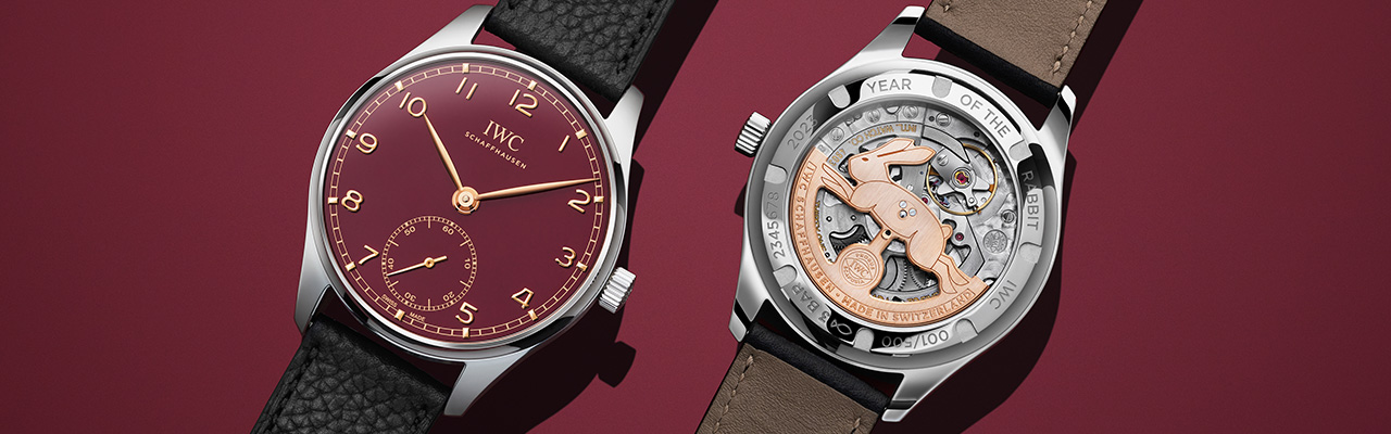 IWC葡萄牙系列自動腕錶40「中國新年」特別版(型號IW358315)限量發行500枚,採用40毫米精鋼錶殼、酒紅色錶盤,以及鍍金指針和時標。酒紅色為經常用來歡慶中國新年的鮮紅色彩的迷人變化。紅色是長壽、幸福及成功的象徵,同時也被認為可以帶來好運。只要透過透明藍寶石玻璃底蓋一瞥IWC萬國錶自製82200型機芯,就能發現這款特別版腕錶的真正亮點:兔子造型的鍍金擺陀。比勒頓自動上鏈系統把佩戴者的手臂動作有效地轉化為主發條的能量,提供60小時動力儲備。除此之外,錶背環上還有「2023 YEAR OF THE RABBIT」鐫刻字樣。IWC葡萄牙系列自動腕錶40「中國新年」特別版隨附兩條小牛皮錶帶:一條為黑色,另一條則是酒紅色漸變。