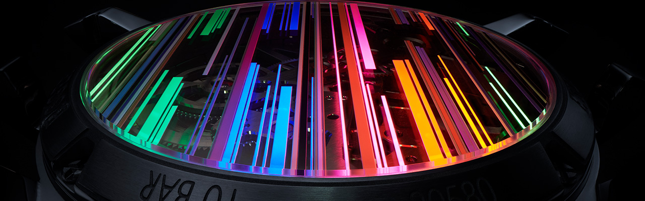 最後一層為藍寶石水晶玻璃錶底,飾有鐳射鎸刻水平線條。線條的凹槽中以手工填入UV塗料,與第一層結構的垂直條紋交錯重疊,形成引人驚艷的對比效果。此獨創工序需要密集勞作,以凸顯當代藝術的真實美感。