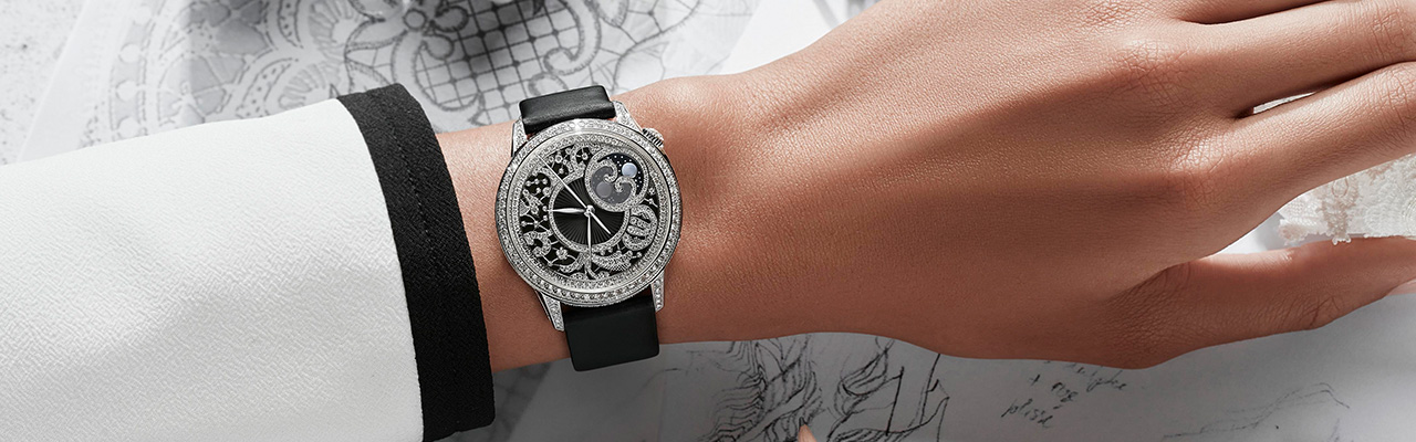 白金材質的蕾絲線細如睫毛,如此纖薄的鑲貼圖案幾乎無法不經彎折便用雙指捏起。為此,雕刻大師和珠寶鑲嵌大師傾盡畢生所學,先由雕刻大師勾勒出花卉圖案和平整區域,再於其他區域自由施展創意,隨後交由珠寶鑲嵌大師在圖案中精心嵌入250顆圓形明亮式切割鑽石,並在錶殼上再鑲嵌292顆鑽石,最後於錶冠上點綴一顆玫瑰式切割鑽石。這款精巧的時計傑作搭配兩條可快速替換的錶帶,分別為黑色缎面效果小牛皮錶帶和黑色密西西比鱷魚皮錶帶,兩條錶帶各配備一枚鑲嵌21顆鑽石的錶扣。