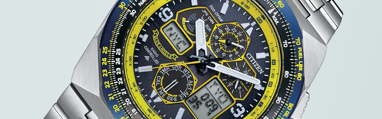 CITIZEN PROMASTER系列「美國海軍Blue Angels藍天使特技飛行中隊聯名腕錶」JY8125-54L,在腕錶配色上使用上藍天使特技飛行中隊”Blue Angels”F/A-18大黃蜂戰鬥攻擊機的專屬色藍、黃色,並且將戰鬥機儀表板概念複製到整個錶盤設計之中,配戴上腕錶有如握上戰鬥機控制桿,跟著藍天使特技飛行中隊探索無盡的天空。為呈現整只腕錶強烈的PROMASTER風格,採用簡約俐落切角的無錶耳設計,有如數道飛機雲劃破天際,在藍天下追求戰鬥機特技的極限角度。