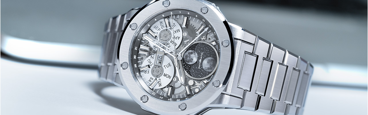 HYBRID - ORIGINAL CALENDAR擁有 「月份」、「星期」、「指針式日曆」以及「月相」顯示。只須於每年 5次的「小月」時,調整日曆顯示,不僅非常適合現代人的緊湊生活節奏, 為使用者腕錶帶來的暢快讀時體驗。