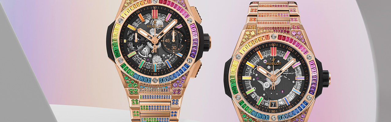 為迎接2023年製錶界的首次盛會,HUBLOT宇舶錶自Big Bang 旗艦系列腕錶汲取靈感,推出兩款以獨家皇金材質打造的彩虹鍊帶腕錶,分別是Big Bang Integrated 計時碼錶和Big Bang Time Only 三針腕錶。兩款腕錶均鑲滿近千顆的彩色寶石,融入極致華麗的高級訂製珠寶元素,不僅彰顯宇舶鑲嵌工坊的縝密鑲嵌工藝,以及宇舶在鍊帶腕錶設計上的極致發展,展現宇舶高階潮流運動腕錶的品牌定位。