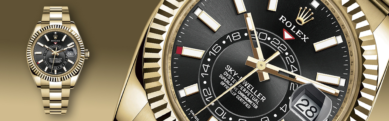 結合實用兩地時間功能的Sky-Dweller是為國際商旅人士所設計,中央時、分指針指示所在地時間,而面盤中間的24小時制數字環則是第二地小時,藉由截然不同的表現形式將兩者明確區分,減少配戴者混淆誤判的可能。採用品牌獨創名為沙羅(Saros)系統的年曆機制,日期機制能夠自動區分大(31)小(30)月份,因此每年只需在特例的二月底轉換到三月時調整一次日期。月份顯示方式也頗獨特,與時標結合,在時標邊緣加開月份視窗,以紅色標示當月月份,配合時標代表數字便能知道月份。巧妙的配置,能減化面盤配置,視覺更俐落。