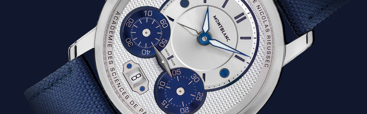 萬寶龍MONTBLANC於2022年末為2007年問世的Nicolas Rieussec計時錶推出現代化改款。此錶是將計時碼錶之父Nicolas Rieussec於1821年所發明的「滴墨式計時器」設計融入製錶而作,將計時、書寫與品牌製錶完美結合,也使用品牌納入百年歷史的Minerva機芯廠後所發表首枚自製機芯。其特徵在於呼應「滴墨式計時器」以兩個旋轉計數器滴上墨水可計算分鐘和秒的機制,面盤下半部設兩片圓形計時盤,藉兩者中間的雙向指針指示,結構看似前衛卻是計時機制最初問世的樣貌。新款延續其獨特計時設計並加入兩地時間功能,覆上藍白新配色與新飾面,多項元素向巴黎致敬,同樣搭載首枚自製機芯。