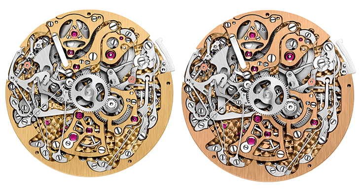 愛彼重新演繹先進的大自鳴鐘樂超問錶科技,巧妙調整 2956 手動上鏈機芯的外觀設計,令其在藍 寶石水晶玻璃錶面下展現迷人風采,譜出最新的超問錶三部曲。這些調整包括 4 點鐘及 6 點鐘位 置夾板鏤空,將軌道分鐘刻度移除,並以拉絲打磨取代珍珠圓點打磨。每款機芯的色調都經過精 心設計,正反兩面均勻一致,同時也與錶殼的色彩和諧匹配。今年,此系列首次利用透明的藍寶 石水晶玻璃錶面,讓機芯成為腕錶真正的面盤。在黑色半啞光處理蛋白石內錶圈吸引下,目光流 連於機芯鉅細靡遺的手工裝飾細節之間,結合傳統與創新的精修裝飾之美盡收眼底。