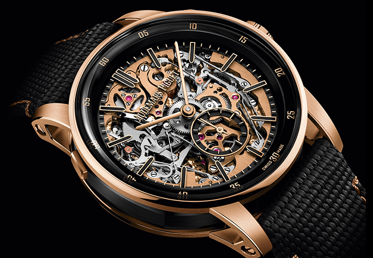 3D 立體面盤點綴著黑色與金色相間的指針、時標及小秒針盤,與錶殼的黑色與金色雙色設計和諧 共鳴。錶面上的黑色細節以電鍍法製作而得,電鍍的時間及溫度都必須控制得恰到好處,方可取 得零件表面呈色均勻的美觀效果。三款腕錶都搭配黑色橡膠覆層錶帶(小牛皮襯裡),飾以與錶殼同色的金色縫線,搭配 K 金 AP 字 樣折疊扣。