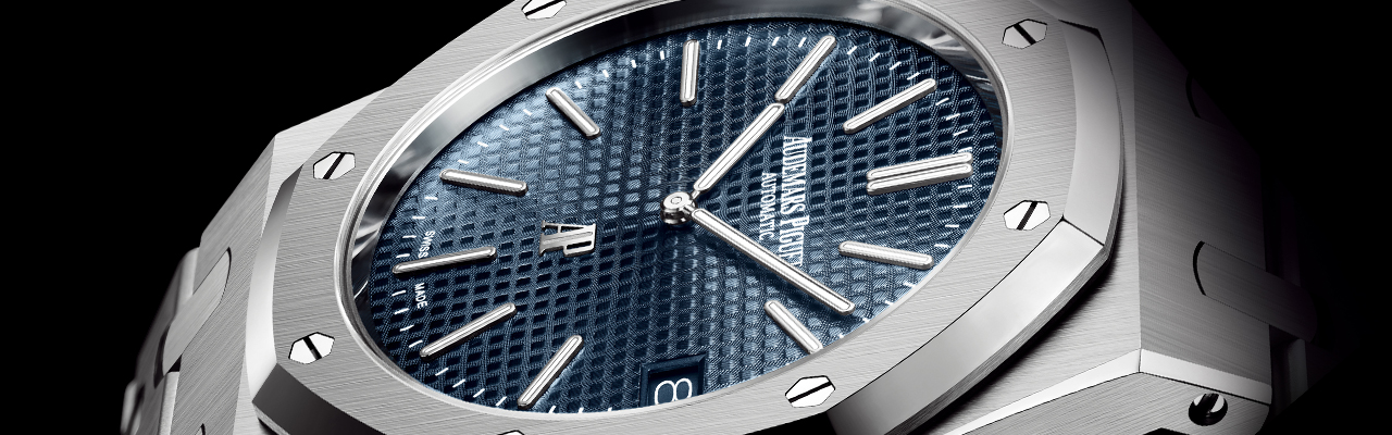皇家橡樹的第二個特徵就是格紋面盤,最初的Jumbo超薄款用的是所謂的小型格紋,後來發展出非超薄的自動款、計時碼錶、石英款等用的大型格紋,以及離岸型使用的超大型格紋。小型和大型格紋面盤都是以機刻雕花工藝製作,在高倍放大鏡下細看,還可發現無數細微顆粒與弧線。此外,鍊帶上連接各鍊節的部件似長方、又如橢圓,就像是八角錶圈每個獨立邊的變形。
