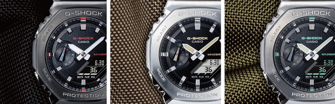 GM-2100C-5A以米色布質錶帶搭配銀色金屬錶圈,在指針部分也加入了米色系的螢光塗料來維持整隻錶款的色彩平衡,非常百搭適合日常上學、上班做搭配。GM-2100CB-1A以灰色布質錶帶搭配經黑色離子IP處理金屬錶圈,錶盤以黑色為基礎,並用紅色進行點綴再以白色打造螢光指針形成強烈對比,外觀簡潔時尚又俐落搶眼,是作為正式場合的最佳首選配件。GM-2100CB-3A則以橄欖色的布質錶帶搭配經亮灰色離子IP處理金屬錶圈,黑色基礎錶盤上採用綠色作為點綴加上淺綠色螢光指針,其獨特外觀引人注目,讓視覺效果更加豐富多彩,是戶外活動愛好者的不二選擇。