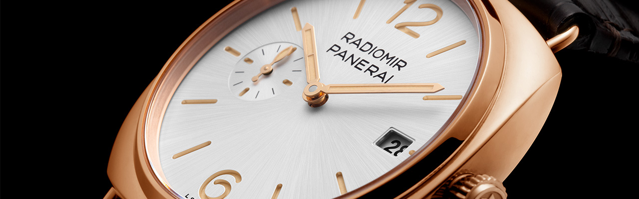 細節悉心配對,塑造時尚格調;經典枕形錶殼,白色太陽射線紋錶盤,只保留12 及6 時位置的數字以追求簡潔佈局。錶盤隨手部擺動反射光線,淺褐色Super-Luminova® 夜光物料在黑暗中會泛起綠色光芒;可替換Panerai 其他錶帶款式,如休閒的小牛皮帶或多種鮮艷顏色的光亮鱷魚皮帶供女士選擇,錶帶可以獨立選購,方便使用者隨心情或場合配襯Radiomir Quaranta Goldtech™錶款。