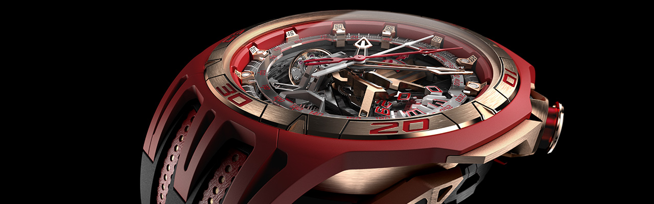當然,外觀也很重要。這款腕錶引人入勝的美感與其傲人機芯互相輝映。直徑47毫米的錶殼採用高科技礦物複合纖維(MCF)製成。這種由Roger Dubuis 羅杰杜彼獨家研發的輕巧材質比陶瓷輕2.5 倍,甚至比碳纖維更輕13%。這意味着腕錶佩戴起來更加舒適,更加適合日常生活。另一個值得關注的是這種輕巧耐用的材料以紅色設計首次亮相,這是一種難以於此材質上實現、需要數年才能掌握的卓絕色調。一如既往,Roger Dubuis 羅杰杜彼在美感方面毫不妥協。