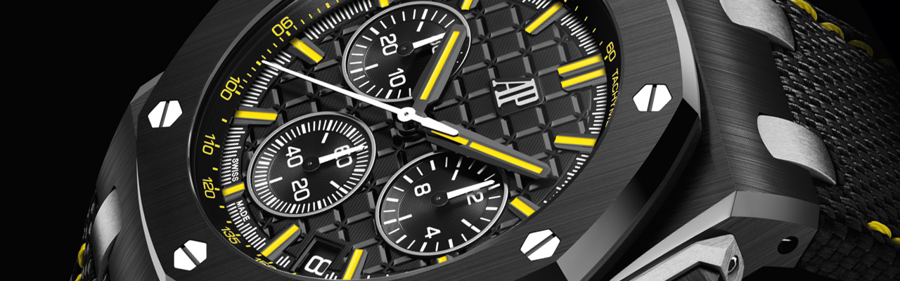 黑色錶面鐫刻新生代「Mega Tapisserie」超大型格紋裝飾,搭配黃色測速儀、時標與指針煥然一新,並與1999年原創款的黃黑雙色設計相呼應。時標與指針均為白金材質,經黑色鍍鎳處理,外覆黃色夜光塗層。K金立體「AP」標誌設於12點鐘位置,三個黑色計時器分據3、6及9點鐘位置,盡顯和諧勻稱之美。