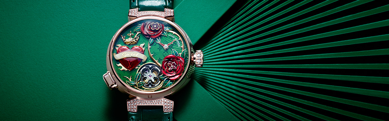 LV表示,其實這並不是品牌第一次使用玫瑰作為圖案主題,這款Fiery Heart的玫瑰概念,其實是衍生自2019年LV為Only Watch拍賣會製作的款式,而成為了表現活動人偶的主概念,面盤以綠色透明琺瑯為基底,透明琺瑯下是LV經典的圖騰,至於玫瑰的花瓣、綠葉都是以金雕完成,並將玫瑰刺人的藤蔓延伸到面盤圈、指針上,玫瑰的紅色可說燒製的濃烈而鮮豔。