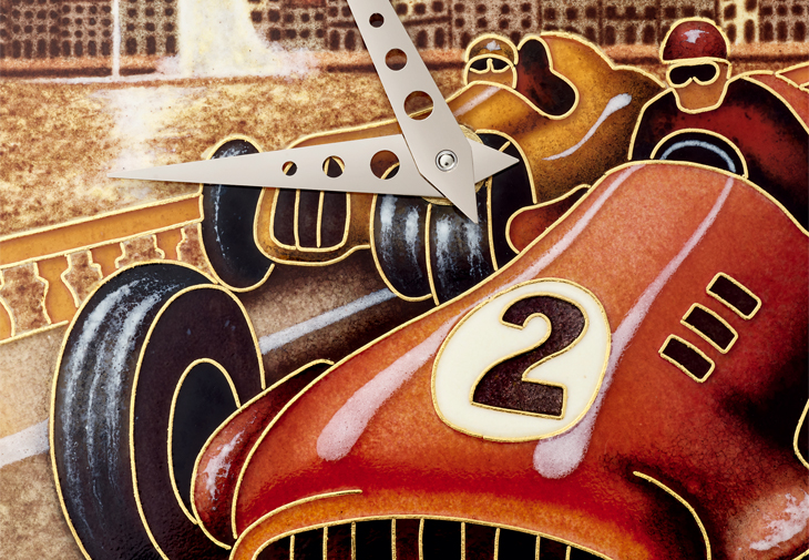 賽車5189G-001腕錶結合了大明 火掐絲琺瑯、微繪琺瑯與金箔琺 瑯(Paillonné Enamel),掐絲琺 瑯的部份用了40公分剖面為0.10 mm x 0.45 mm的金絲,賽車編號 的數字2採用金箔琺瑯技法,在半 透明的黑色琺瑯間加入銀箔,因此 在黑色中映出閃閃金光。海沙色面 的魔鬼魚5077/100R-064腕錶在魚 體用掐絲琺瑯,背景則為弗林克琺 瑯(Flinqué Enamel),後者是先 雕刻再覆上透明或半透明琺瑯的技法,其實不少見,但在台灣卻少用這名稱,特別說明一下。以這款腕錶來說,背景呈現出被水流沖刷成形的海底沙地,沙地的雕刻線條與半透明琺瑯的濃淡搭配得宜,似乎感覺得到水在流動的樣子;再加上姿態生動、立體感十足的魔鬼魚,令人驚嘆工藝非凡。