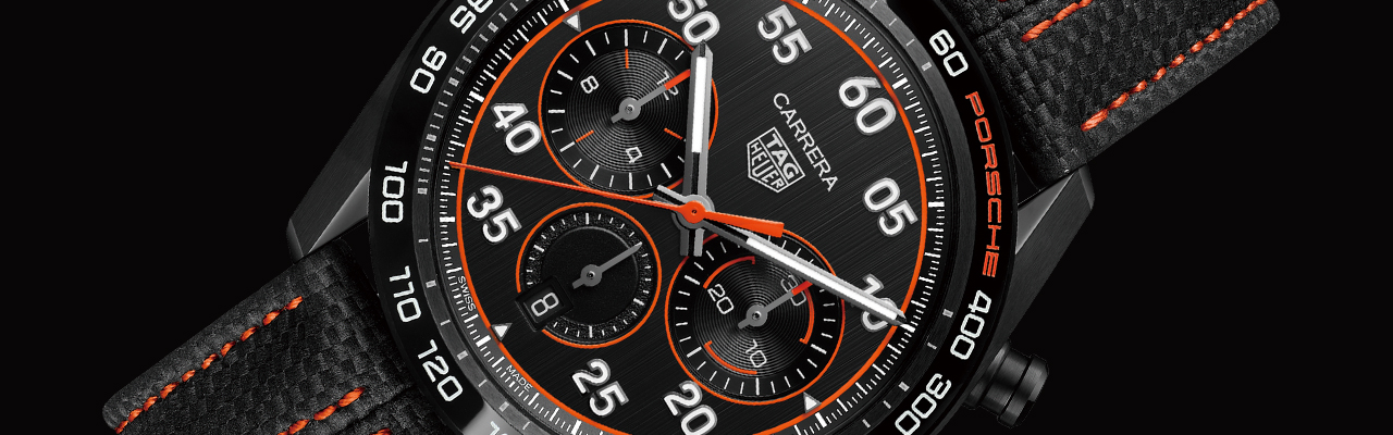 泰格豪雅TAG HEUER在2023年推出與保時捷PORSCHE聯名的第六只錶款─TAG Heuer Carrera X Porsche Orange Racing。兩個品牌淵源頗深,保時捷在1954年的「卡萊拉泛美越野大賽」(Carrera Panamericana)贏得勝利,以此命名最強大的車型,時任泰格豪雅執行長的傑克·豪雅聽說此熱血賽事,以此命名1963年發表的計時錶,Carrera錶款之名由此而來。此聯名款承襲系列設計基礎,以亮眼的橘色配搭黑色,其靈感來自於汽車在瀝青路上激起火花的顏色,以此呼應賽車的競速概念。錶圈上刻有亮橘色的PORSCHE字樣,內部搭載Heuer 02機芯的導柱輪零件也使用橘色。