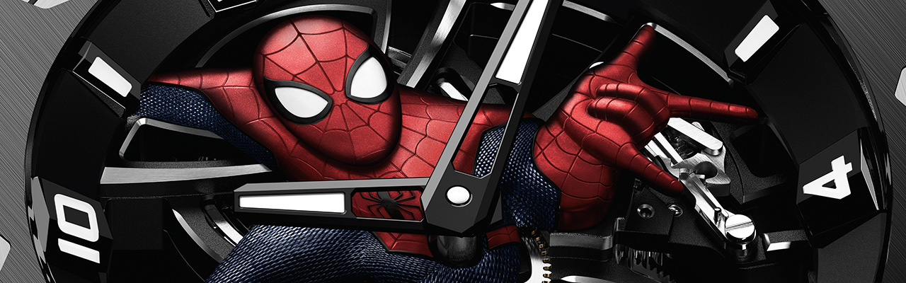 黑色PVD鍍膜K金時標與阿拉伯數字時標交錯妝點錶面,搭配K金指針。時標與指針皆經亮面拋光打磨,外覆白色夜光塗層,在黑暗中發出藍色螢光,巧妙呼應「Spider-Man」的標誌色彩。這款腕錶擁有符合瑞士高級製錶傳統與品牌經典設計的精修裝飾,錶殼正面及背面經亮面拋光與微珠噴砂交錯處理,側面則經霧面打磨。機芯亦經多道裝飾工序,從拉絲打磨、噴砂處理到亮面拋光一應俱全。