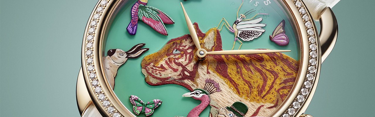 讓老虎周圍的動物活靈活現也是同等大事:透過手工雕刻和塗繪的蝴蝶、蜂鳥、烏龜和孔雀等金質貼花,賦予錶盤獨特的浮雕視覺效果。在它們旁邊,工匠投注五天的心力,以多層次的微繪工藝創造兔子和螳螂微妙的立體感。這款俏皮又充滿工藝技術的作品採用38 毫米玫瑰金錶殼,錶圈並鑲嵌82 顆天然美鑽。