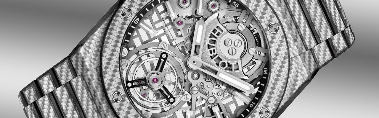 首度以鍍鋁碳纖維製作鍊帶,裝配鏤空HUB 6035陀飛輪機芯,縱使這次還為機芯加上QR Code風格的底版,但全錶重量也僅68克左右。且材質親膚性佳,配戴更舒適。限量50只。