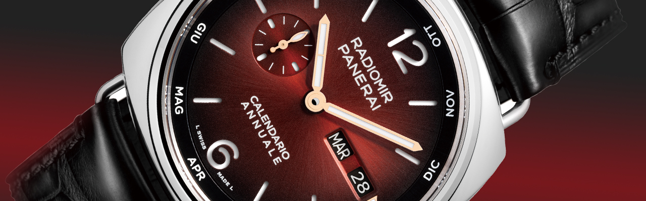 沛納海今年發表設計簡潔的Radiomir年曆腕錶,日期與星期在三點鐘位置,月份則由外圍的月份環轉動指示(三角箭頭處);透過透明底蓋,能看見內部的P.9010/AC自動機芯。