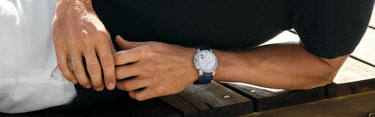 日期環與小時和分鐘環相交,形成一個完美的8字,而這個符號亦有無限之意。日期環疊於另外兩個小錶盤之上,以爪鑲鑽石的方式標記月份中的偶數日期。月相錶盤相對較小,位於5點鐘位置,增添一抹低調而優雅的氣息。月相盤鑲嵌著18K黃金凸面圓月,與藍色背景相呼應,四周環繞的圓形明亮式切工鑽石恍若璀璨星光。
