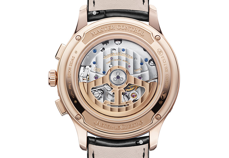 Master Control大師系列腕錶採用直徑40毫米的玫瑰金錶殼,錶圈稍為向外傾斜,設有充滿動感的弧形錶耳,彰顯風格休閒而簡約的優雅風範。緞面打磨的錶殼側面和錶耳,與拋光錶圈、錶冠和錶耳側面互相映襯。腕錶的細節一絲不苟,背面錶圈綴以浮雕裝飾,而透過藍寶石水晶底蓋更可欣賞機芯的精緻裝飾。這款腕錶風格雋永,搭配洋溢現代氣息的實用長方形計時按鈕,錶殼厚12.05毫米,比例恰到好處。黑色鱷魚皮錶帶為玫瑰金錶殼增添迷人魅力,流露出歷經時間考驗、經典優雅的美學特色。