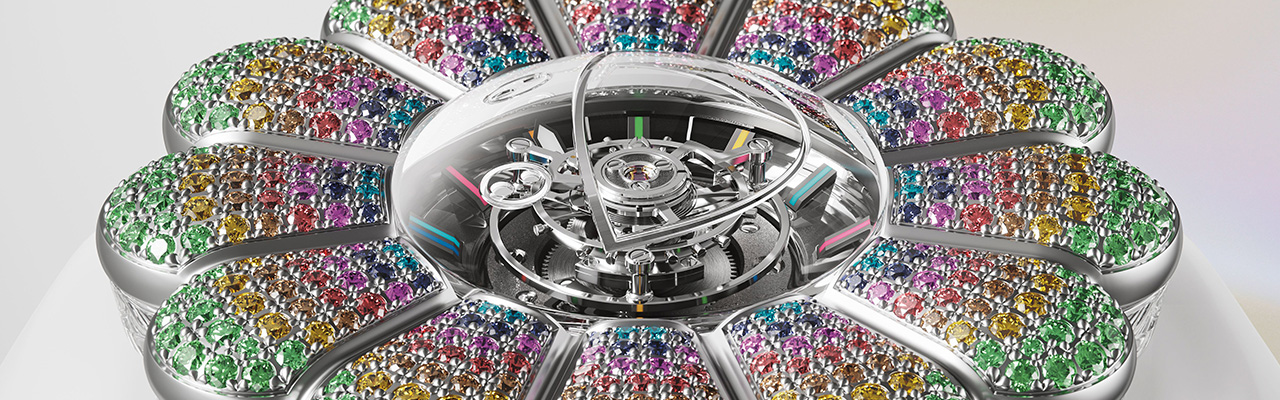 這款MP-15腕錶的12個發光刻度與12片花瓣配色,皆呼應宇舶錶為Only Watch 2023特別設計的配色。鑲嵌的444顆彩色寶石也跳脫了傳統的彩虹色系與排列方式,而是以童趣蠟筆塗鴉的手法,將各色寶石從內而外層層暈染擴張。從綠色到黃色、橘紅色、粉紫色、靛色和藍色等各色彩寶,展現繽紛的色彩。宇舶更精心打造立體感的花瓣,以營造花朵綻放的旺盛生命力。
