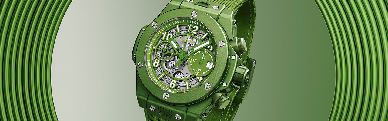 Big Bang Unico Nespresso Origin腕錶以綠色的秘魯有機咖啡膠囊為整體配色,錶冠鐫刻Nespresso的「N」。42毫米的鋁製錶殼是融合密度不同的鋁材質與28% Nespresso咖啡膠囊的回收鋁,製成錶殼、錶圈、錶冠和按把,並均經過陽極氧化緞面與拋光處理,以呈現鮮豔的綠色色調,演繹優雅與活力相容的創新色彩。