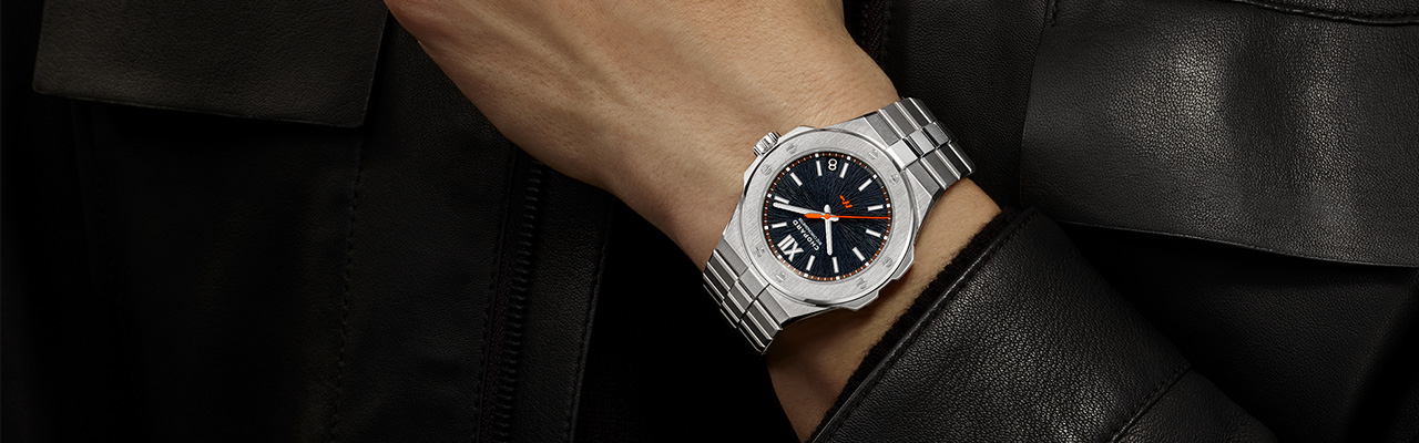 Alpine Eagle Cadence 8HF腕錶錶盤綴以「老鷹虹膜」圖案,向此系列的靈感來源 – 雄鷹的銳利目光致敬。錶盤所呈現的極致黑色,靈感源自夜闌人靜之時,野生動物頻繁出沒的山間夜晚顏色。橙色秒針搭配鷹羽形平衡錘,以及相襯的分鐘軌刻度圈,與錶盤形成優雅對比,更顯運動風範。