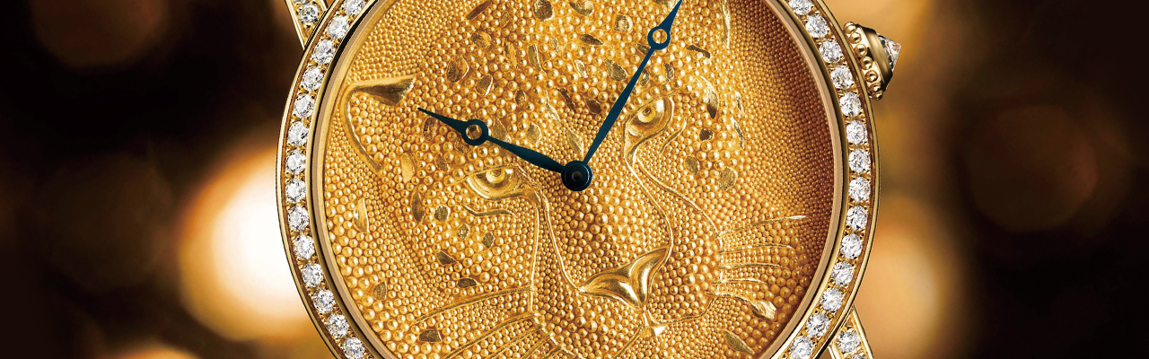 2013年卡地亞初次挑戰這項工藝,製作出以金屬珠粒工藝打造的美洲豹腕錶。卡地亞將22K純金細線邊剪成小段、邊進行高溫加熱,當金段熔化,遇室溫凝固就形成金珠,接著就將這些金珠一顆一顆置入需要裝飾的部位,與金質底座粘連,整個過程彷彿是在面盤撒上純金的「種粒」,進而塑造出生動立體的浮雕圖案,視覺相當獨特。值得注意的是,過去這種工藝是使用在器物上,由於其面積、體積大,因此較為容易,這裡將工藝應用在厚度僅1mm、面積不到30mm的面盤,可謂更是艱難。