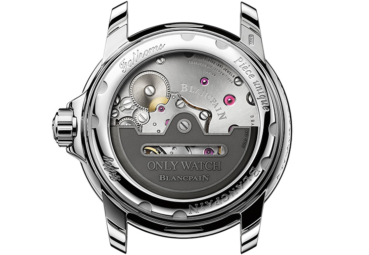 透過透明底蓋,機芯的頂級打磨及裝飾一覽無遺:巨大尺寸寶石和18K金質上鏈自動盤,採用NAC鉑鍍層,並刻有Only Watch Blancpain的字樣。精鋼錶殼的尺寸與今年初推出的「五十噚自動潛水腕錶 70周年官網限定版」的尺寸相同,均為42.3毫米。