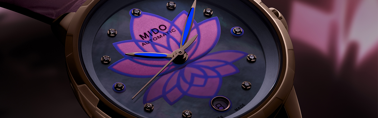 Rainflower花雨系列靈感來源於新加坡藝術科學博物館,受其宛如盛放蓮花的獨特外觀啟發,MIDO美度表得以創造出Rainflower花雨系列女士腕錶的精巧設計。水中芙蓉綻放於映射細膩光澤的珍珠母貝錶盤之上,與其倒影一同為鑽石的靈動光芒所環繞。昏暗環境中,柔美動人的錶盤在夜光塗層加持下散發紫色輝光,濯濯清蓮晝夜盛放,更顯光影流轉之巧思。