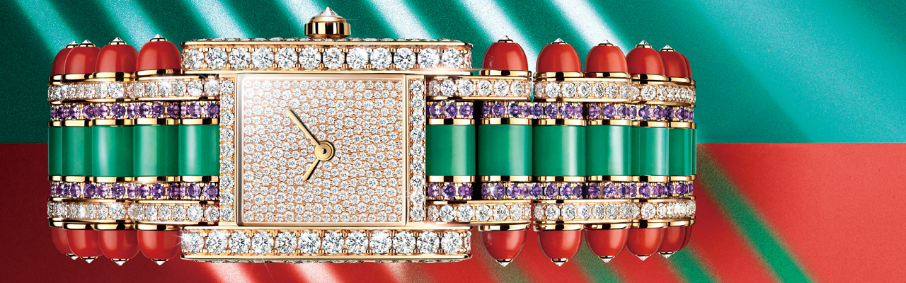 前者錶殼的垂直兩側與上下方的平行線條上鑲嵌 了不同大小的鑽石,搭配縞瑪瑙與黃金組成黑金 配色鍊帶;後者則在垂直兩側鑲嵌紅寶石,上下 方平行線條鑲嵌鑽石,而白鑽裝飾,也從錶殼延 伸到鍊帶,為寶石鍊帶增添更多華美光澤,此款 搭配縞瑪瑙與綠玉髓組合鍊帶。另一只奢華版本 採用18K玫瑰金材質,面盤採雪花式鋪鑲鑽石面 盤,錶圈上也同樣裝飾不同大小鑽石,搭配繽紛 色彩的綠玉髓、珊瑚與紫水晶組合鍊帶,視覺上更為富麗華貴。