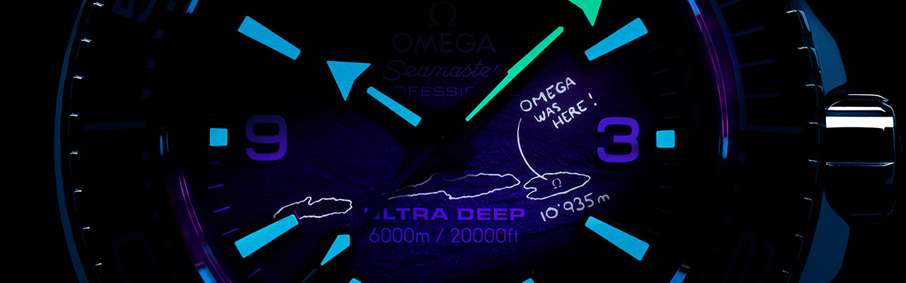 防水150米的Aqua Terra使用淡淺清新的水藍色,隨著越往下潛陽光越少,300米、600米的錶款面盤逐漸加深,到了1200米的Ploprof潛水錶,深藍佔了大部份面積,僅在反光處呈現藍白色澤,而Planet Ocean 6000米Ultra Deep潛水錶則選用最深的藍色,呈現馬里亞納海溝最深處10,935米「挑戰者深淵」的海底地貌。這樣的設計是歌頌防水15,000米的歐米茄Ultra Deep Professional於2019年探訪挑戰者深淵的世界紀錄。