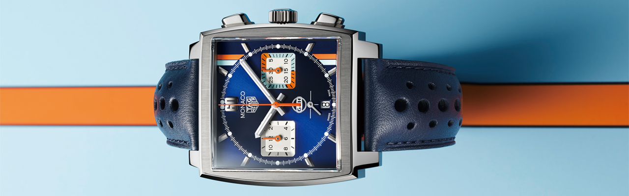 而Monaco系列中的Monaco Gulf特別版腕錶,則是代表海灣石油(Gulf)與泰格豪雅過去的 緊密合作關係。因為在1960、 1970年代,海灣石油所贊助的 JW Automotive Engineering車隊, 在耐力賽名垂青史。該車隊還在 1970年和1971年網羅了包含駕駛 保時捷917的知名瑞士賽車手喬·希 弗爾特(Jo Siffert), 而他更是當 時豪雅的品牌摯友,也就是最早的 品牌大使之一;另外,他還是電影 《極速狂飆》的賽車教練。