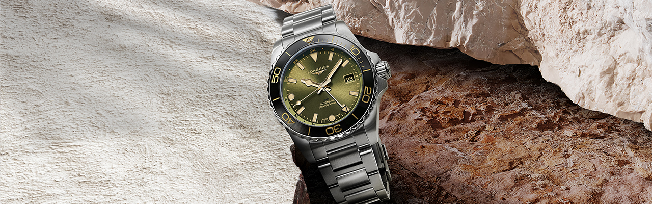 全新 HYDROCONQUEST GMT全新面盤融合忠於潛水錶語彙的時標設計,以鍍金或銀色拋光指針及鍍有Super-LumiNova®夜光塗料時標,任何環境都易於讀取;交錯拋光與緞磨裝飾的表面為全新錶款增添精緻與優雅氣息,提供綠色、棕色、黑色與藍色陽光放射紋面盤,並配上雙色24小時刻度相互襯托。除此之外,全新HYDROCONQUEST GMT 重新打造錶耳、護橋設計,並於12點鐘方位搭載一顆螢光膠囊的全新單向旋轉陶瓷錶圈,以及旋入式錶冠,打造兼具現代和復古元素的精緻外型。