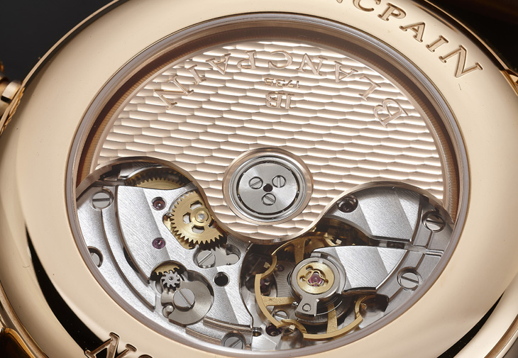 錶款裝載6950GC自動上鍊機芯,雙發條盒提供72小時動力儲存。透明底蓋可見有日內瓦波紋與蜂巢扭索飾紋的金質自動盤,為機芯帶來高質感的賞玩性。自動上鍊搭配長動能,表示錶款會有更好的扭力維持運作穩定,帶來更好的精準度,也說明錶款定位在日常配戴的正裝款。此外,這款腕錶還有個獨家設計。不同大多品牌會在錶側設置隱藏按鈕,需以工具單獨快調特定顯示功能。寶珀則是將隱藏按鈕設置在錶耳下方,用指尖便能單獨調整大日期或逆跳星期。不過因為按鈕很小,可能還是用個小棒子會比較方便。