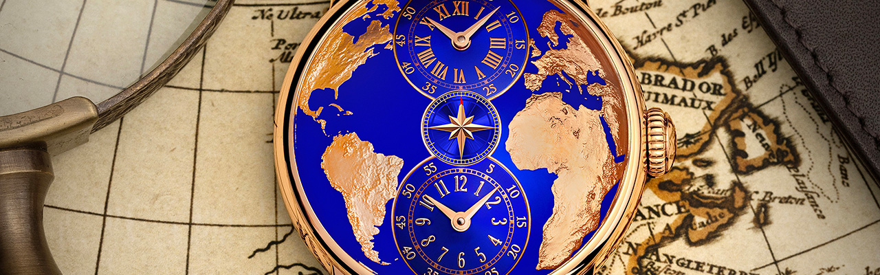 面盤基底以拱形的黃銅打造。地圖中陸塊的部分以高精密度雷射雕刻而成,陸塊表面則採用特製的高精密模具壓鑄。三個小錶盤由面盤基底中雕刻出造型。整塊面盤全部加工完成之後,再經過電鍍處理,覆上玫瑰金鍍層。而地圖中海洋的部分則是藍色彩漆,所有過程全以手工塗繪。金色的羅馬數字、阿拉伯數字與軌道式時標,則是在藍色彩漆之上進一步壓印而成。經過多道複雜面盤製作程序,讓這款兩地時間成為融合了科技、美學與情感的工藝極品。