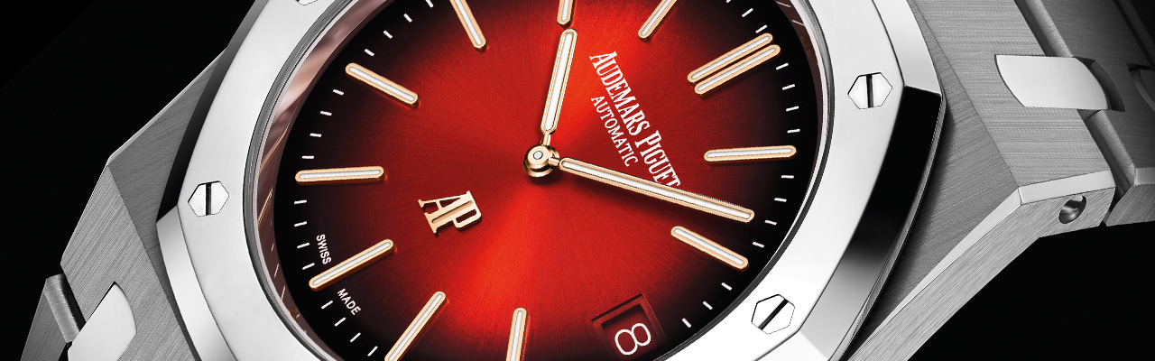 全新Royal Oak 皇家橡樹系列「Jumbo」超薄腕錶搭配煙燻酒紅色太陽紋錶面,艷麗的色彩與高科技材質錶殼及鏈帶的金屬色調形成對比,為腕錶增添一抹神秘吸引力。螢光塗層18K 玫瑰金時標和指針,與6 點鐘位置的拋光立體AP 標誌互相輝映。日期視窗採用酒紅色背景,襯托出醒目的粉紅色數字顯示。展現和諧勻稱的整體設計。
