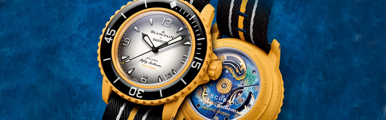 本次全新聯名計劃中, Swatch 推出五款全新錶款致敬這經典錶款,同時以趣味及俏皮的方式展現其真實個性。該系列以 Bioceramic Scuba Fifty Fathoms 為名,參考了 Swatch 自家品牌錶 SCUBA 潛水錶系列。此非限量系列中的腕錶忠實呈現出 Fifty Fathoms 腕錶的所有特點:卓越的防水性能、絕佳易讀性、機械機芯、堅固的旋轉錶圈和防磁保護。Blancpain 與 Swatch 聯手從深海汲取靈感,打造出以五款Swatch 錶款所組成的聯名系列,每一款腕錶均以地球五大洋命名,分別為:ARCTIC OCEAN、PACIFIC OCEAN、ATLANTIC OCEAN、INDIAN OCEAN 和 ANTARCTIC OCEAN。