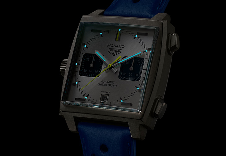 時標與指針上覆有藍色 Super-LumiNova® 夜光塗層,確保在任何晝夜環境的最佳易讀性。此外,萊姆黃塗漆中央指針則增添色彩對比效果,這些設計元素融合誕生了 TAG Heuer Monaco 計時腕錶賽車藍限量版迷人和諧的外觀,更塑造出一款完美體現賽車運動精神並驚豔人們的腕錶傑作。